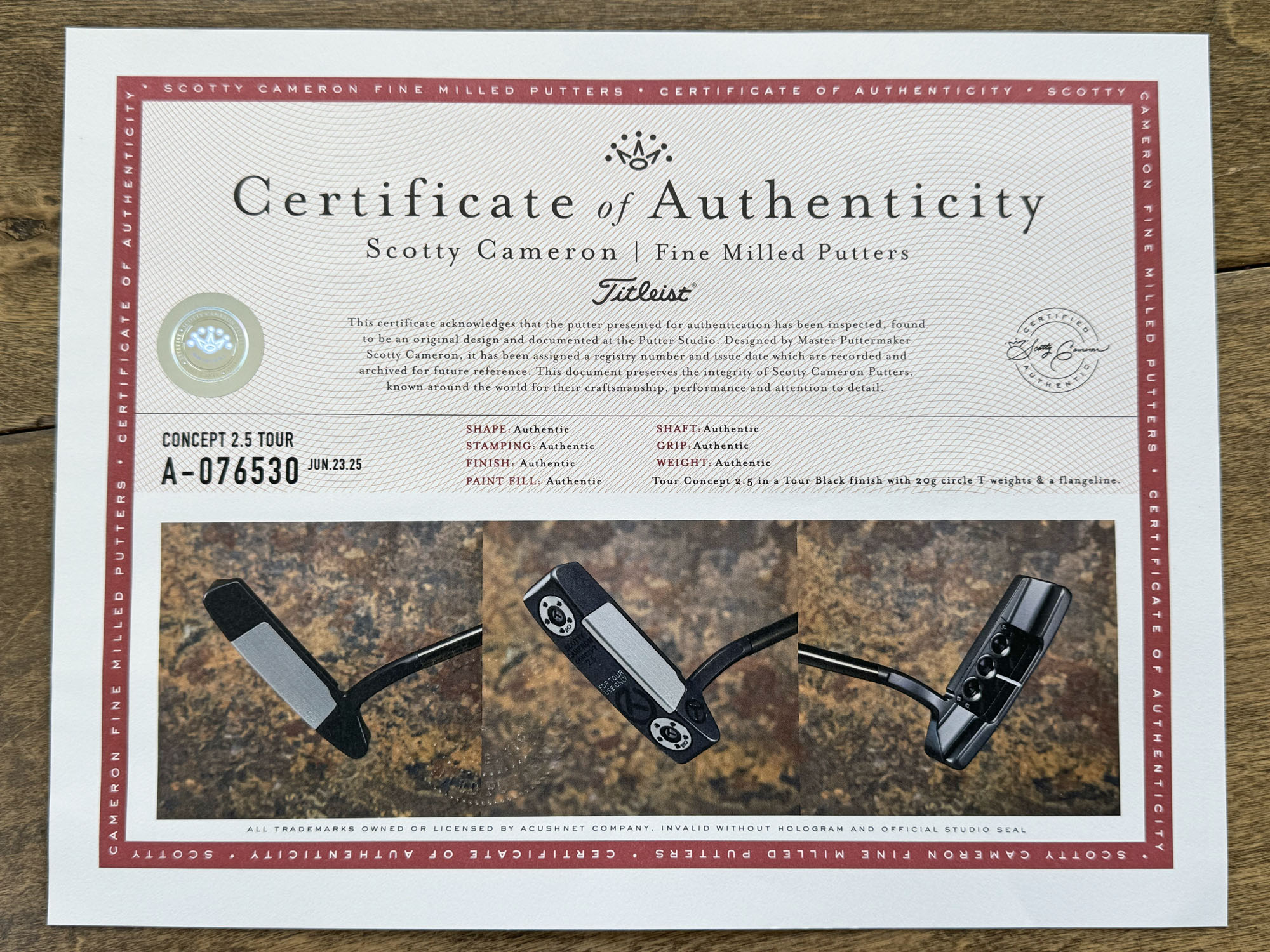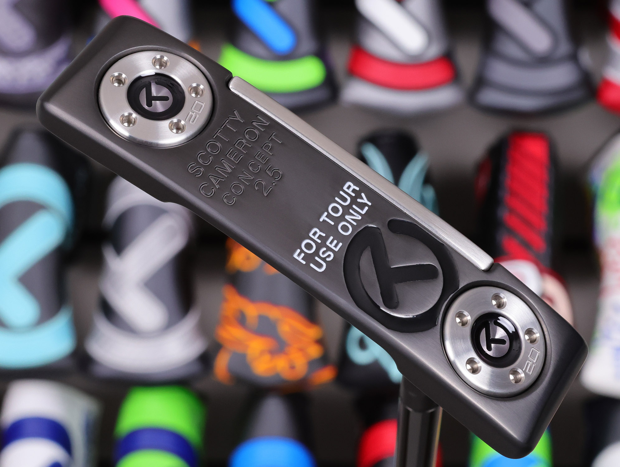 Notes: This rare Concept 2.5 was recent restored back to flawless condition at the Scotty Cameron Custom Shop! Highlighted by a Tour Only Black Circle T shaft and Translucent Smoke paint fill for a stealthy look! Included are the matching Circle T grip, Genuine Leather headcover and Certificate of Authenticity. Actual item pictured.
