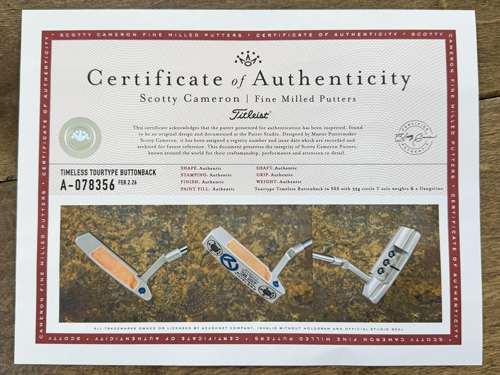 Notes: This putter features Scotty’s newest “Timeless TourType” head shape and iconic Teryllium Insert for unmatched sound and feel! Recently sent to the Scotty Cameron Custom Shop for a new Circle T shaft, Circle T grip and Circle T weights. It also received custom Translucent Blue, Translucent Smoke and Gray paint fill. It has been used and shows light sole wear. From address it still looks like new! Included are the matching Circle T grip, Industrial “Junk Yard Dog” headcover and Certificate of Authenticity.
